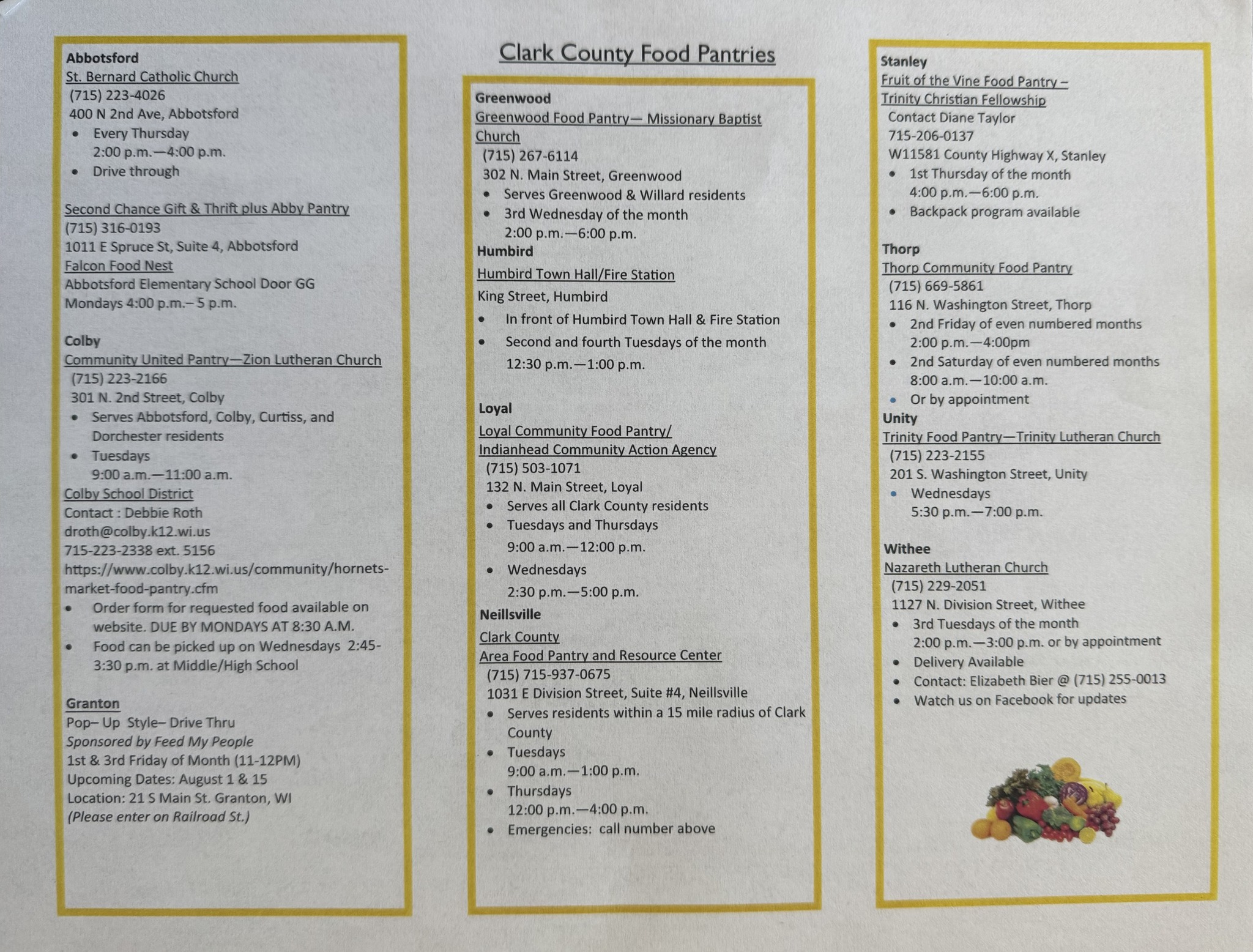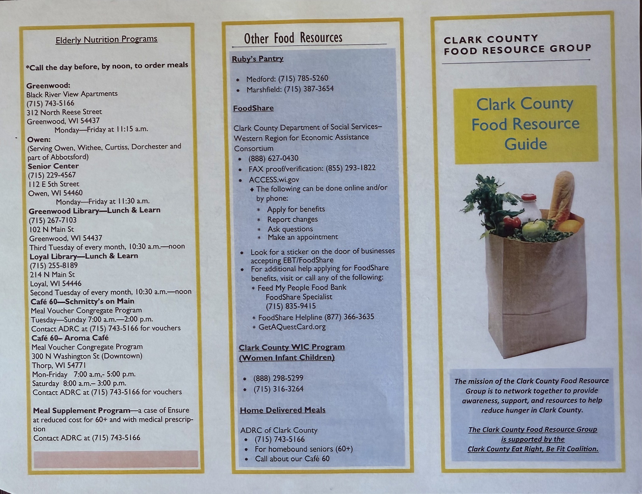 Here is some information for the Clark County area. If you are looking for additional information, please call 211 or our office at 715-507-5005.